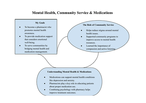 This handout explores the vital connection between mental health and medication management. It highlights how pharmacy professionals, combined with an understanding of psychology, can support individuals experiencing mental health challenges. Through community service and education, future pharmacists can play a crucial role in reducing stigma, promoting awareness, and providing compassionate care to improve overall well-being.